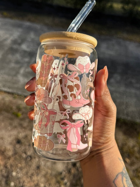 Libbey Glass Cup with Pink Cowboy Boots | Cute Western Aesthetic Iced Coffee Cup | 16oz Beer Can Glass with Lid & Straw | Girly Cowgirl Gift