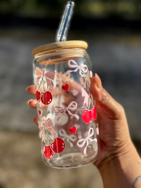 Libbey Glass Cup with Pink Bows & Cherries | Cute Aesthetic Iced Coffee Cup | 16oz Beer Can Glass with Lid & Straw | Girly Gift Idea